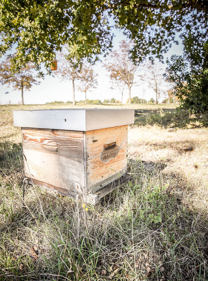 Depuis 2020, nous avons cinq ruches d’abeilles noires du Médoc sur la propriété, et travaillons avec les ruchers du Littoral.